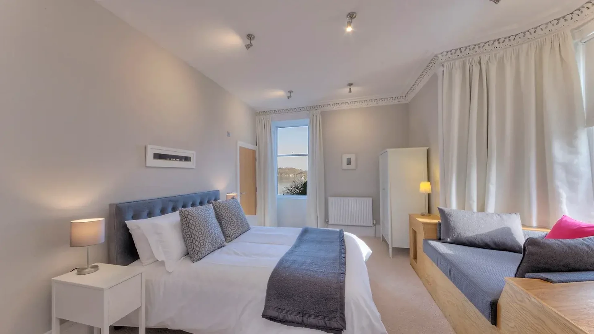 The Turret is a unique apartment with stylish contemporary interiors in a converted shoreside Victorian mansion on the outskirts of Oban. The generous open-plan living space has a corner turret with panoramic views of Oban harbour and the Sound of Kerrara.